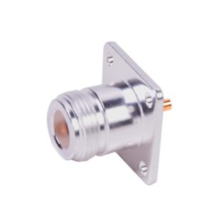 Conector N Hembra de Montaje de Panel con 4 perforaciones a 12.7 mm, soldable.
