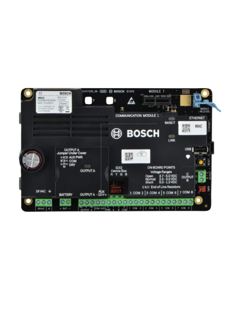 - Puerto Ethernet en placa para la comunicación de alarmas IP de Conettix y programación remota, compatible con las redes IP modernas incluidas IPv6/IPv4, IP automática y Plug and Play Universal.