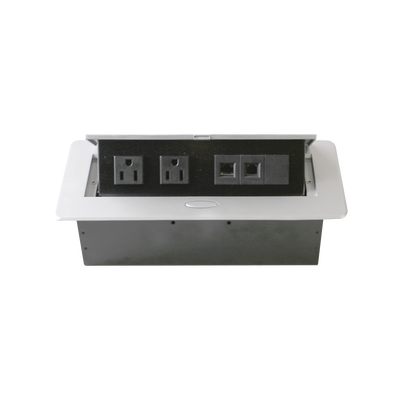 - Caja horizontal diseñada para soluciones de conexión de electricidad, voz/datos y multimedia para el mobiliario de salas de juntas, oficinas, etc.