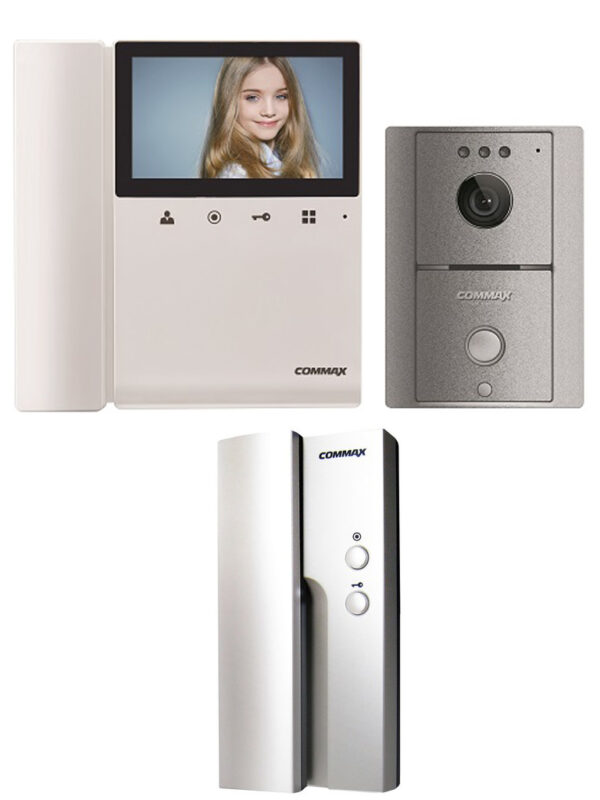 COMMAX CDV43K2DRC4LGPAQ – Paquete con monitor de 4.3 pulgadas y frente de calle con apertura de puerta, el monitor y el auricular se intercomunican