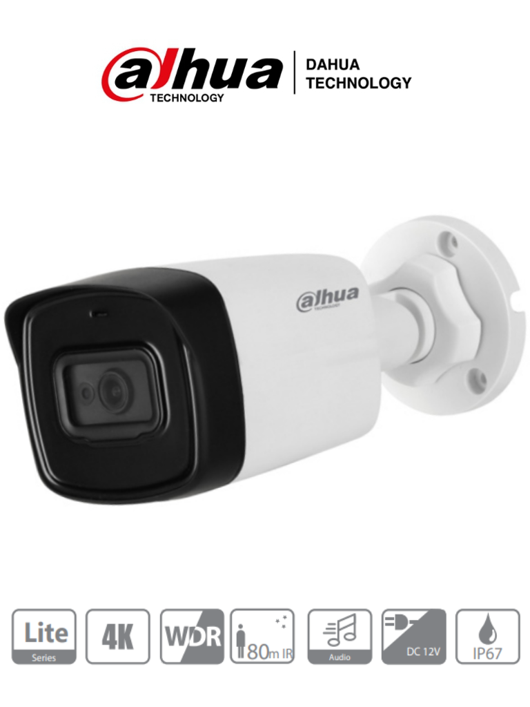 La cámara modelo HFW1801TL-A es una cámara bullet de 8MP ( 4K ) de resolución,con la cual podemos apreciar una imagen con mayor nitidez, brillo y claridad que cualquier otra cámara de video-vigilancia. Este modelo incorpora un lente de 2.8mm, potentes IR con alcance de hasta 80m para la visión nocturna y también dispone de la tecnología WDR real 120dB que ofrece imágenes más nítidas incluso en las condiciones de contraste de luz intensas, además cuenta con índice de protección IP67 por lo que ofrece protección contra polvo y agua.