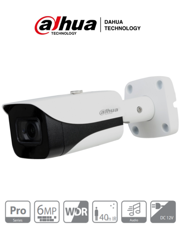 DAHUA HFW2601E-A-036 – Camara Bullet de 6 Megapixeles/ Lente 3.6 mm/ WDR Real 120 dB/ IR de 40 Mts / IP67/ Microfono Integrado + 1 Entrada de Audio/ #SeriePro