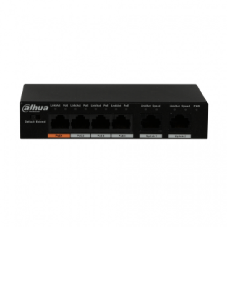 El modelo PFS3006P60 es un Swicth Fast Ethernet de 4 puertos, con una transmisión PoE de larga distancia de 250 metros. Cuenta con 4 puertos PoE 10/100Mbps y 2 puertos de enlace ascendente de 100 Mbps. Está equipado con 2 modos de transmisión (Predeterminado / Extendido), que son controlados por un interruptor dip switch.