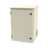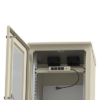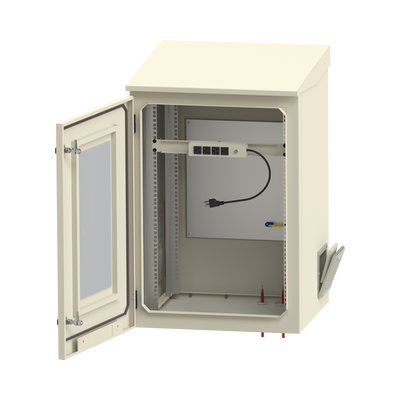 Gabinete para Exterior con Ventiladores y Termostato con Rack de 19″ de 9 Unidades con capacidad de ser instalado en torre, poste o pared.