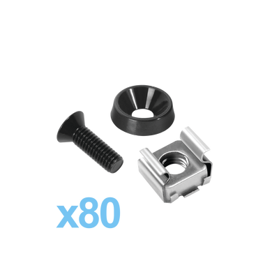Kit de 80 tornillos con arandela y tuerca enjaulada para rack.