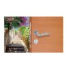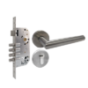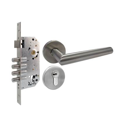 - Mecanismo de pasador con picaporte, sin cilindro ni escudos.
