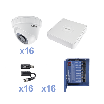 KIT TurboHD 720p / DVR 16 Canales / 16 Cámaras Eyeball (interior 3.6mm) / Transceptores / Conectores / Fuente de Poder Profesional / NO INCLUYE DISCO DURO.