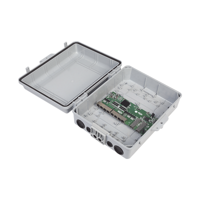 Switch WISP/FTTx con 7 puertos PoE inverso de 24V Pasivo (PoE in), 1 puerto PoE out de 24V + 2 SFP, Integrado con Gabinete NEMA IP67 para exterior
