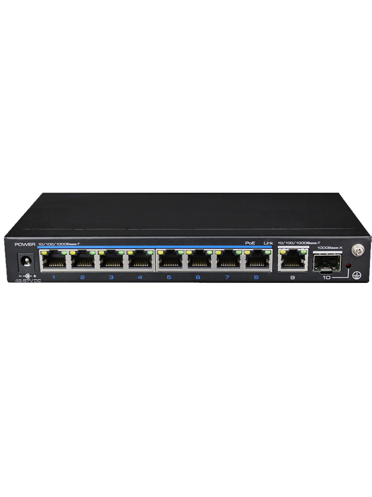 El switch Utepo UTP3GSW0802TSP120 cuenta con 8 puertos Gigabit Ethernet PoE para la descarga (Downlink) de información, puede conectar hasta 8 cámaras PoE sin necesidad de conectarlas a una fuente externa (siempre y cuando su consumo de corriente no sobrepase el total que soporta el equipo). Adicionalmente cuenta con 2 puertos para subida (Uplink) de información de los cuales se dividen en 1 puerto Ethernet RJ-45 10/100/1000Mbps Base-T y 1 puerto SFP 1000Mbps Base-X y así poder tener comunicación con su NVR, servidor, etc.