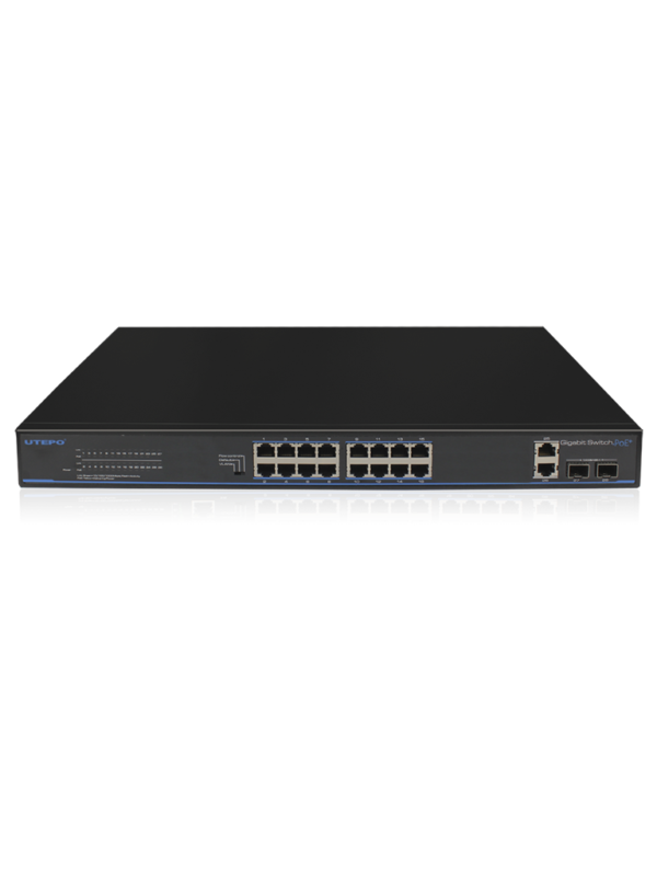 Los switches Utepo de 16 puertos Ethernet Gigabit PoE, son una serie de equipos no administrados que son diseñados para todo tipo de aplicaciones PoE ya que cuenta con 16 puertos (PoE) para descarga de información, así como 2 puertos RJ-45 Gigabit (10/100/1000Mbps) para la subida/carga de información y adicionalmente cuentan con un capacidad de 2 puertos SFP (1000Mbps) Base-X también para la subida/carga de información.