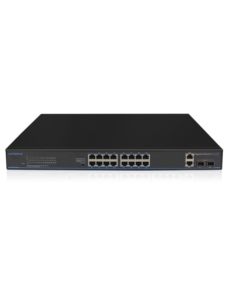 Los switches Utepo de 16 puertos Ethernet Gigabit PoE, son una serie de equipos no administrados que son diseñados para todo tipo de aplicaciones PoE ya que cuenta con 16 puertos (PoE) para descarga de información, así como 2 puertos RJ-45 Gigabit (10/100/1000Mbps) para la subida/carga de información y adicionalmente cuentan con un capacidad de 2 puertos SFP (1000Mbps) Base-X también para la subida/carga de información.
