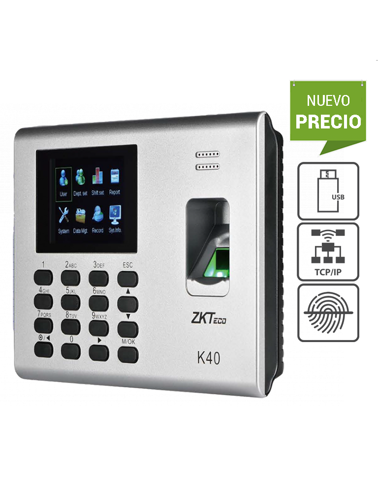 ZKTECO K40 – Control de Acceso y Asistencia Simple / 1000 Huellas / TCPIP / Descarga de USB en Hoja de Cálculo / 2 Horas de Respaldo